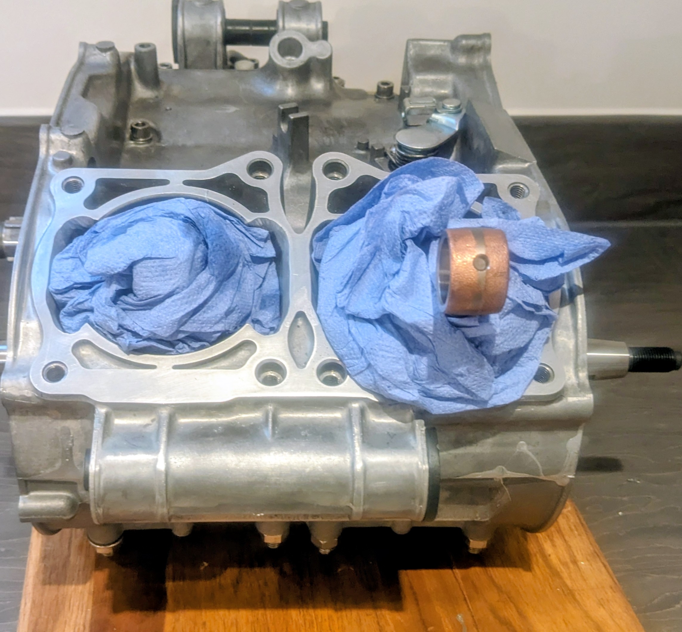The upper crankcase halves have been installed with lightweight titanium studs.