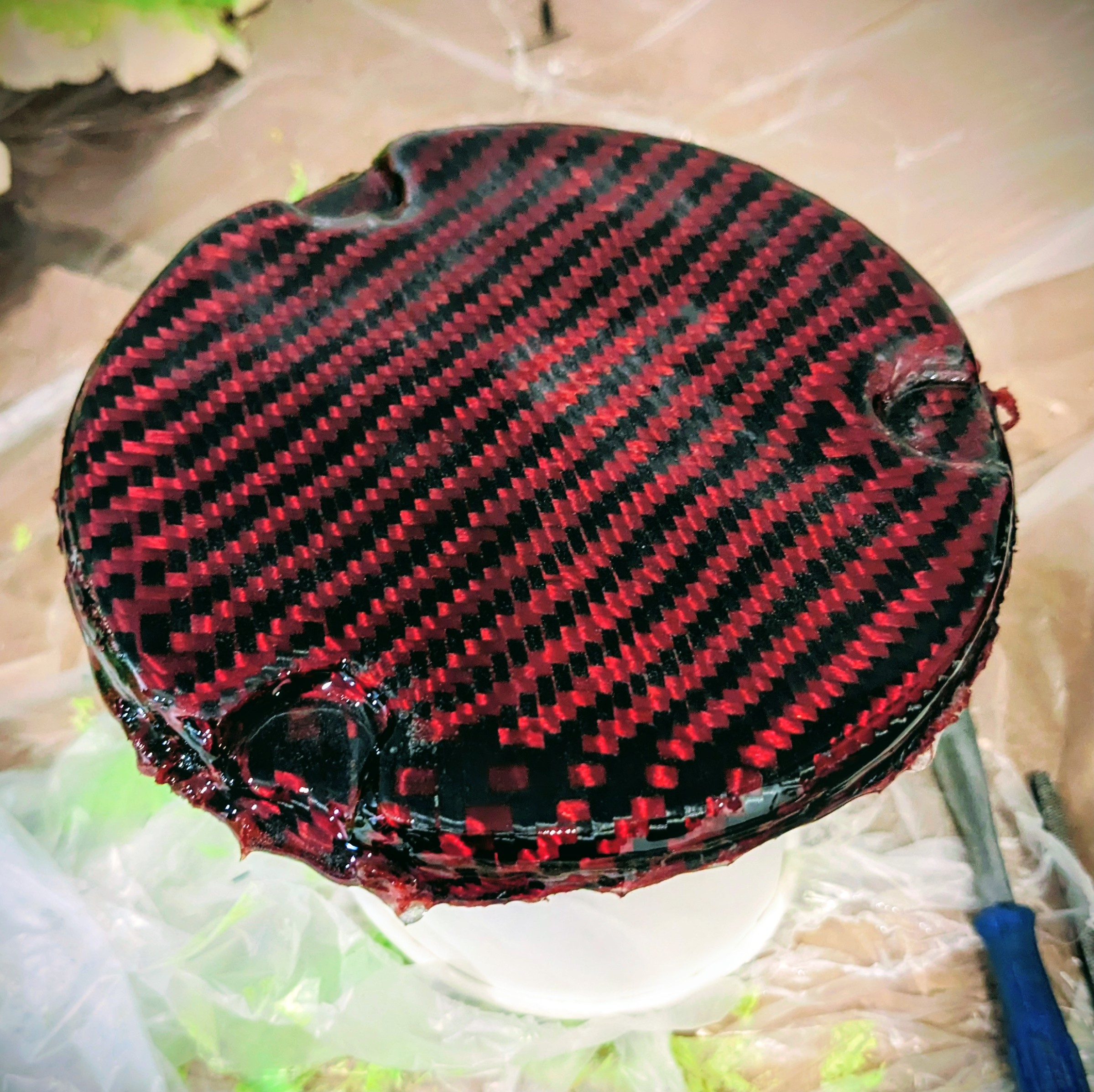 Sadly, I ran out of carbon fibre weave to actually progress with this and I'm not sold I want the red carbon/polyester weave, however I've seen you can get red pigments for the epoxy resin which I may give a go with this mould.