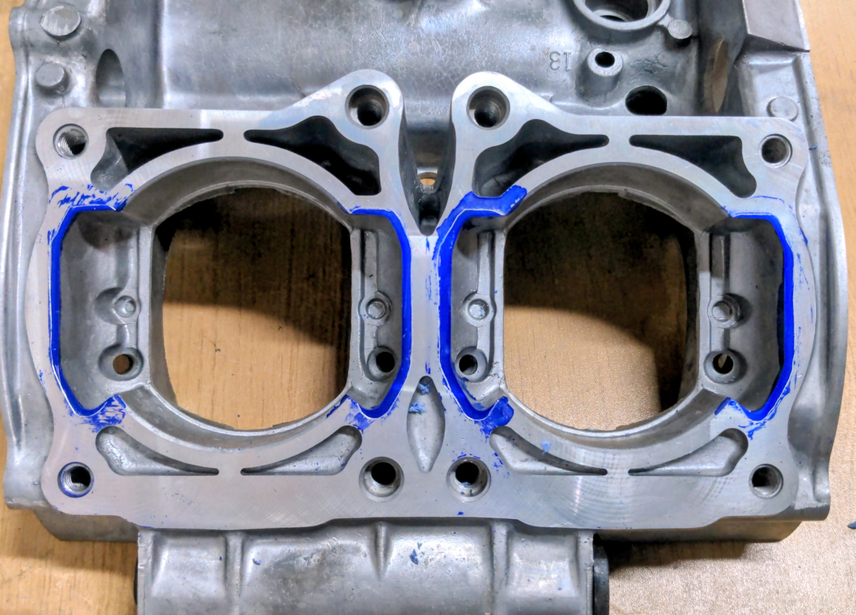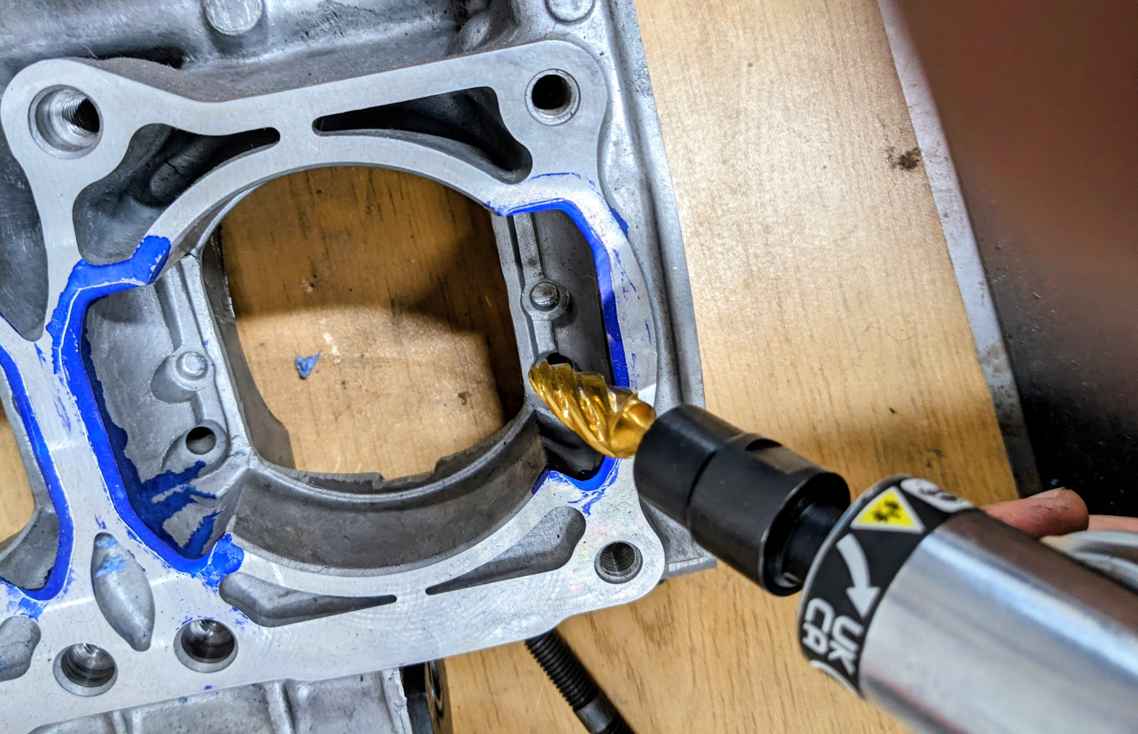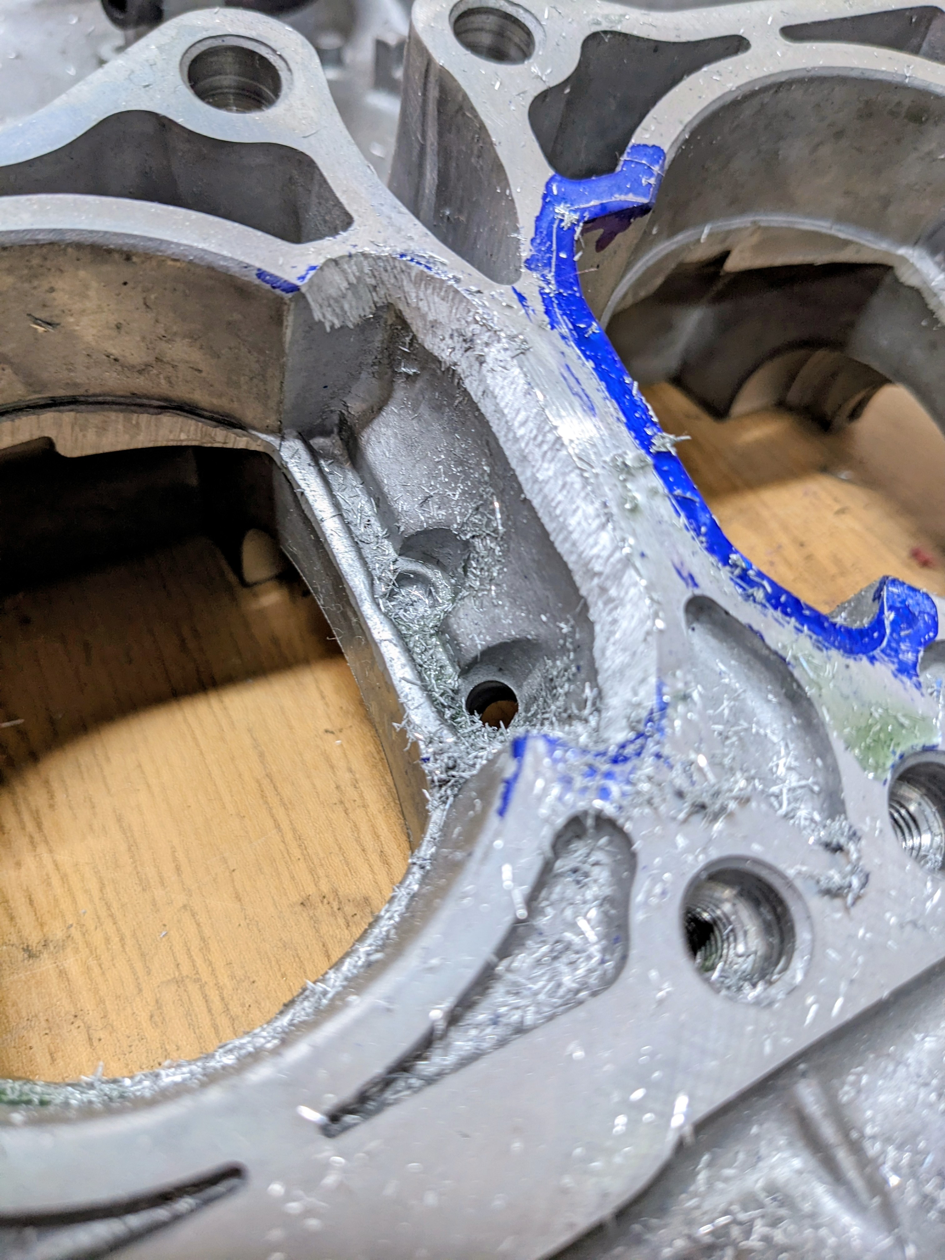 Dykem Blueengineering fluid, then scoring a visible outline using myFacom Scribeand then with my die grinder, porting the bottom end to match.For reference again, the engine cases I bought were brand new direct from Yamaha. As such this gives a good example of how much, unmolested cases need to be grinded away.