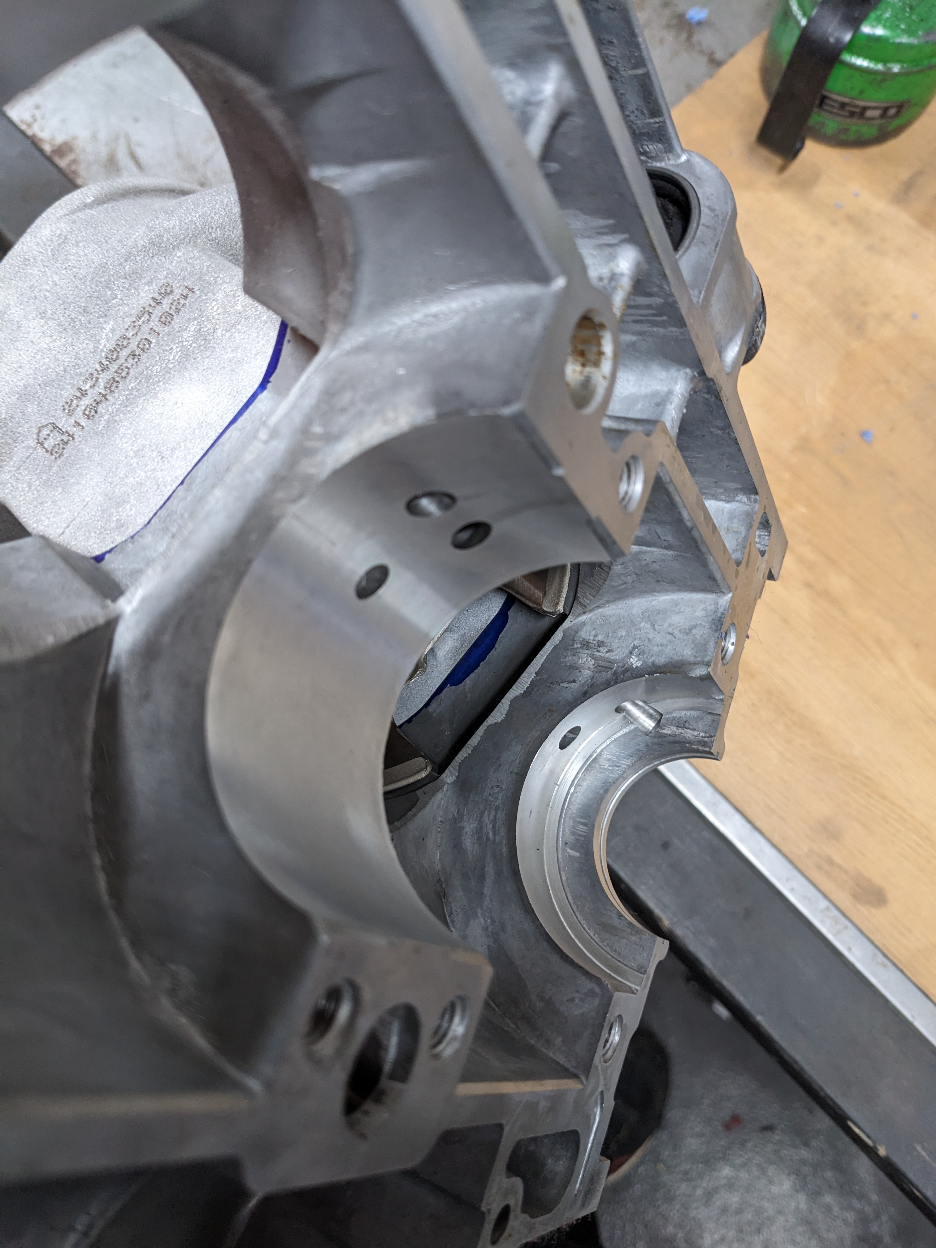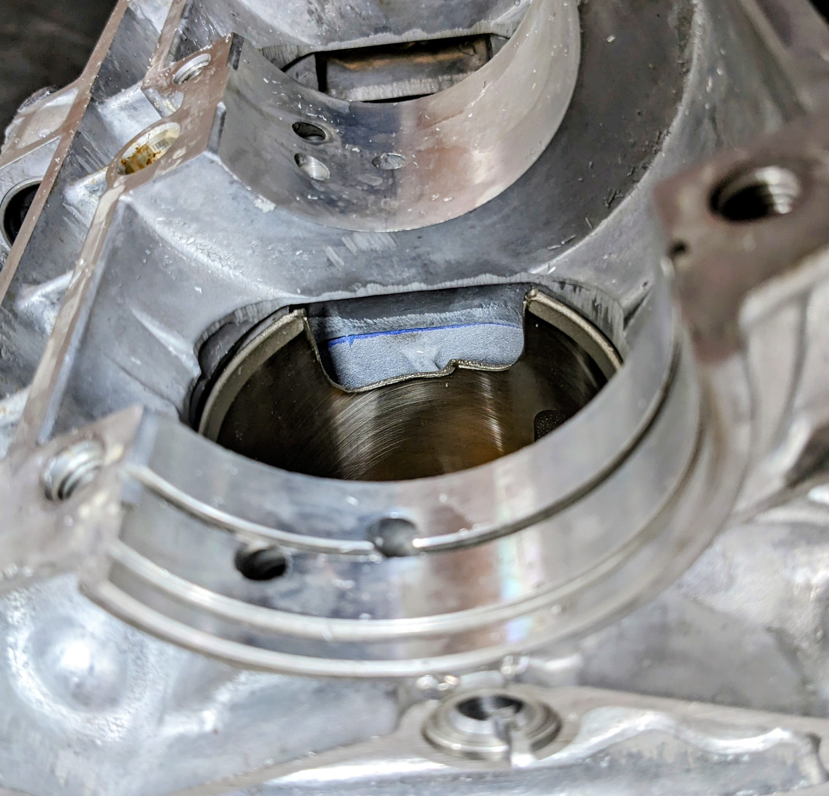 Dykem Blueand assembled the cylinder to the bottom end. This squished out excess fluid and left a visible line of where the cases meet the cylinder.