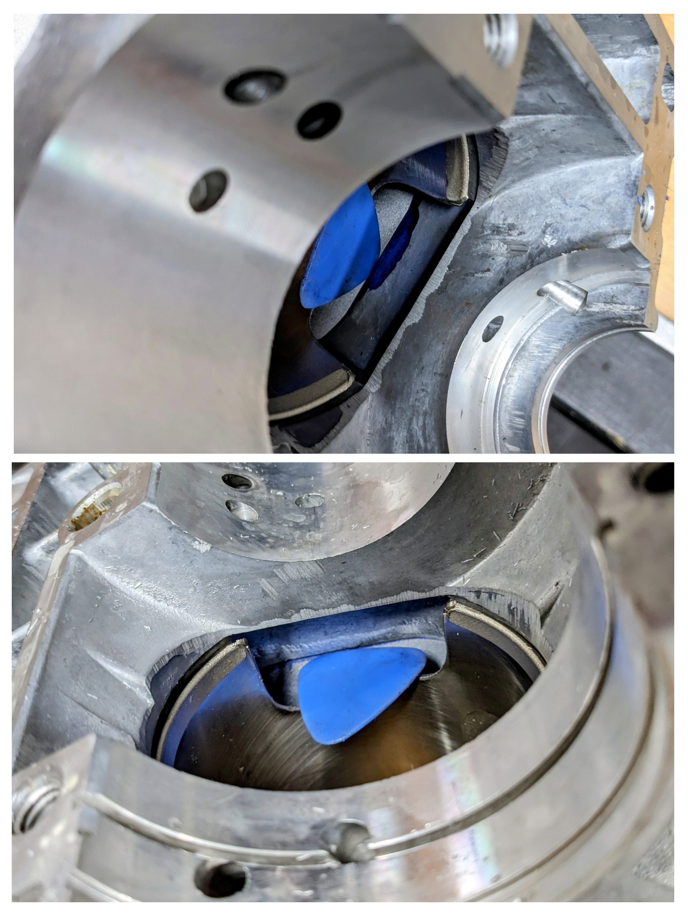 You can see here a Before/After photo and how now the pick is not being covered by the bottom end transfer ports and now correctly aligns to the cylinder transfers.